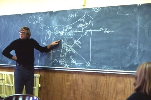 Pete seems to be explaining his rounds on campuses with CES, Christian Educational Services. I see Waynesburg College and California University marked with an "X" at the bottom of his map. Regardless of its size, Pete usually filled up the entire blackboard. I pretty sure that's what he's done here. He never erased the board very well. If I am right, then this photo is actually kind of rare. Usually Pete would just erase a hole in the middle of his work and kept going from there.
